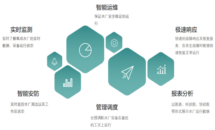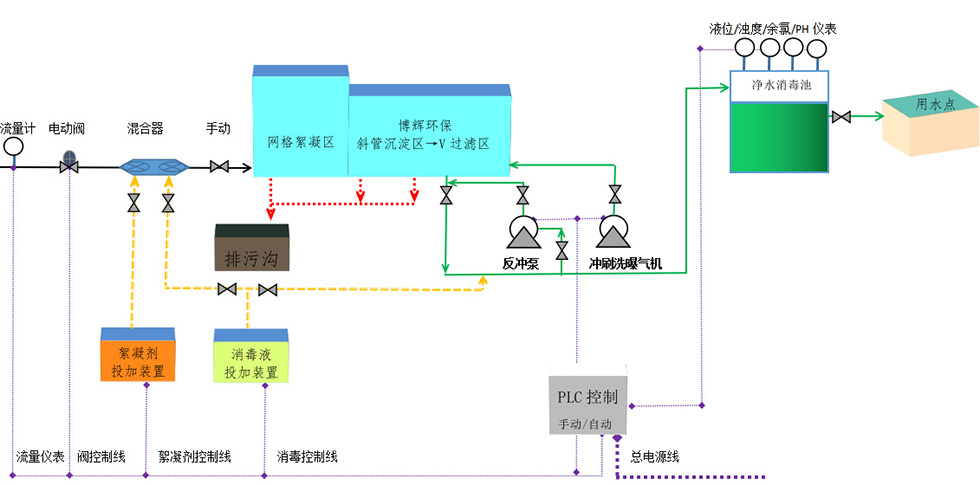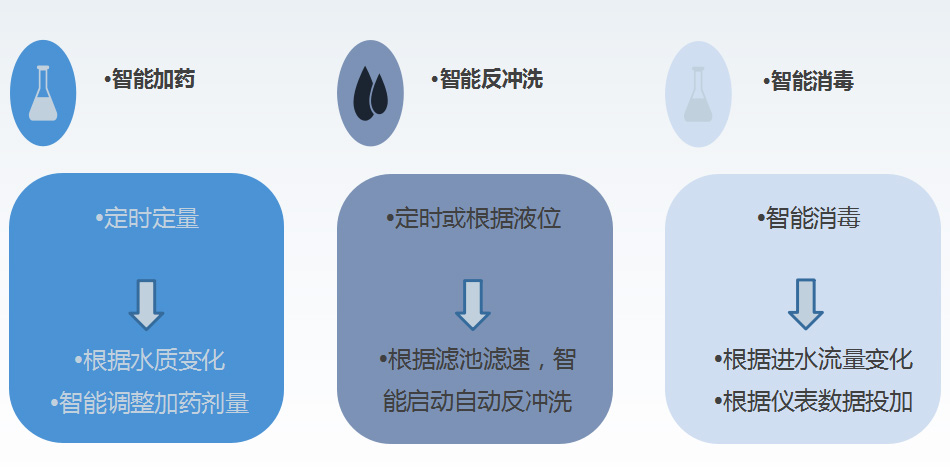 | 智能加藥系統(tǒng) | 絮凝加藥量/消毒液加藥量根據(jù)在線儀表測量數(shù)據(jù)實(shí)時(shí)控制運(yùn)行 | ||||||||||