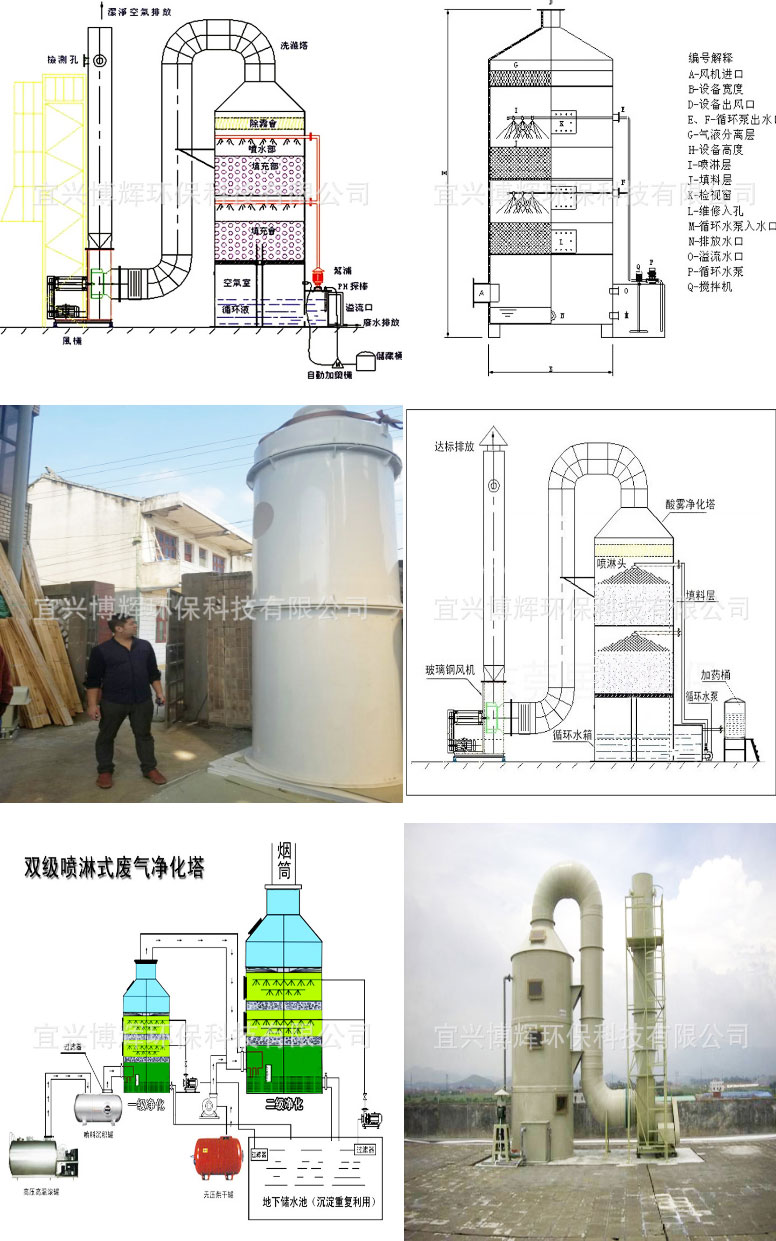 本設(shè)備分單塔體和雙塔體。采用圓形塔體,用法蘭分段聯(lián)接而成。具體由貯液箱、塔體、進風段、噴淋層、填料層、旋流除霧層、觀檢窗、出風口等組成。
