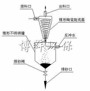 當水流在一定的壓力下從除砂進水口以切向進入設備后,產(chǎn)生強烈的旋轉(zhuǎn)運動,由于砂和水密度不同,在離心力、向心力、浮力和流體曳力的共同作用下,使密度低的水上升,由出水口排出,密度大的砂粒由設備底部的排污口排出,從而達到除砂的目的,具有除砂率高,節(jié)省安裝空間,對個別微小固體的漏捕率低,工作狀態(tài)穩(wěn)定等優(yōu)點。