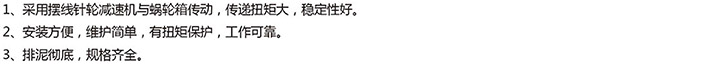 刮吸泥機(jī)主要由橋架、減速電機(jī)板、吸泥管、中心集泥槽、撇渣裝置鋼出水槽、出水堰板等作為配套輔件中心回轉(zhuǎn)支承、穩(wěn)流筒、框架鋼結(jié)構(gòu)、臂架、集泥刮就地控制箱等部件組成,并可將鋼制進(jìn)水柱管、不銹驅(qū)動(dòng)裝置采用蝸輪減速電機(jī),并內(nèi)置壓簧式過(guò)力矩保護(hù)機(jī)構(gòu);驅(qū)動(dòng)電機(jī)采用Y型電機(jī),電源為3P、380V、50HZ,防護(hù)等級(jí)IP55,F(xiàn)級(jí)絕緣;在工作時(shí),各吸泥管自成單元,吸泥濃度可通過(guò)設(shè)在中心集泥槽的流量調(diào)節(jié)閥控置就地控制箱為戶外型,不銹鋼外殼,雙層門密封,手動(dòng)和遠(yuǎn)程控制。