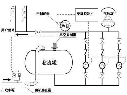 1. 當(dāng)市政管網(wǎng)本身滿足供水需求時(shí);設(shè)備處于停機(jī)狀態(tài),市政水源通過(guò)旁通管路或流經(jīng)水泵直接向用戶管網(wǎng)供水。